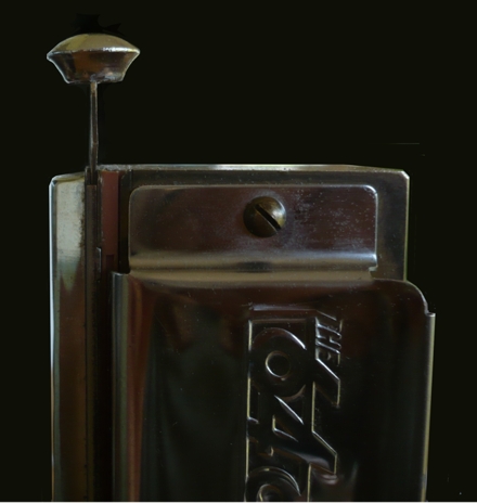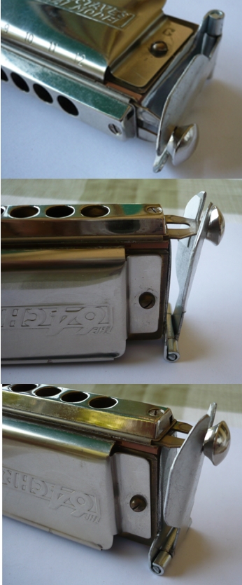 En esta imagen en la que vemos a una armónica de perfil, se aprecia la delgadez de esa pieza y su vulnerabilidad a cualquier choque o roce. Cuando se dobla por accidente, es muy difícil conseguir que recupere la forma exacta y se pone en peligro la integridad de todo el instrumento. Muestro aquí abajo mi aportación al refuerzo y protección de dicho deslizador con una solución que ya me ha mostrado en alguna ocasión su utilidad.