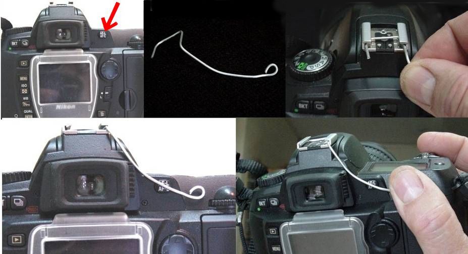 Como no es cosa de ponerse a cambiar el botón de sitio, he colocado a la máquina una especie de prótesis que acerca el botón hasta la mano de la fotógrafa. Se trata de un alambre de acero de un milímetro de diámetro que se encaja en la zapata del flash y que pasa por encima del botón sin tocarlo. Cuando se pulsa el alambre, su flexibilidad le permite bajar y empujar el botón como si se estuviese pulsando directamente con el dedo.