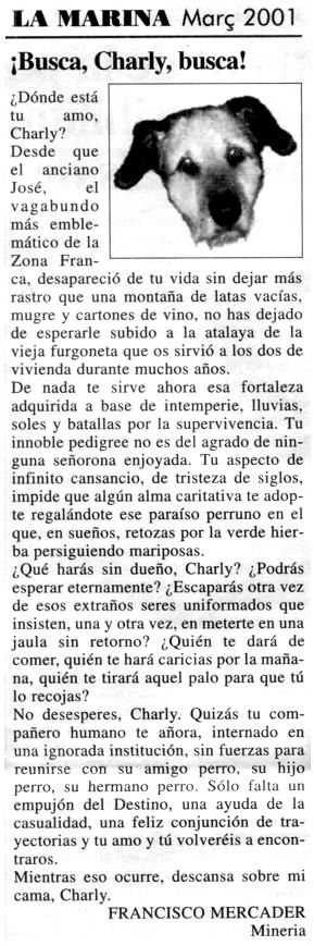 La primera vez que ví a Charly formaba parte de una extraña comitiva: un vagabundo viejísimo empujaba lentamente una carretilla llena de chatarra. A su lado, caminaba una triste fila compuesta de tres perros; uno, grande y viejo; otro, muy pequeño y desgarbado. Delante de ellos, otro, mezcla de mil razas, de unos treinta kilos, joven y musculoso pero de andar cansino: ése era el que yo conocería después como Charly. Durante unos años anduvo este peculiar grupo por la Zona Franca de Barcelona mientras el vagabundo iba envejeciendo todavía más, sin remedio. Un día dejó de empujar la carretilla, quizás ya sin fuerzas para ello. Dos de los perros desaparecieron y sólo quedó Charly para hacer compañía a su dueño. El recorrido de la pareja se limitaba ya a ir diariamente desde la furgoneta abandonada que les servía de refugio hasta una taberna cercana. Un día, a finales de 1999, descubrí a Charly caminando solo.